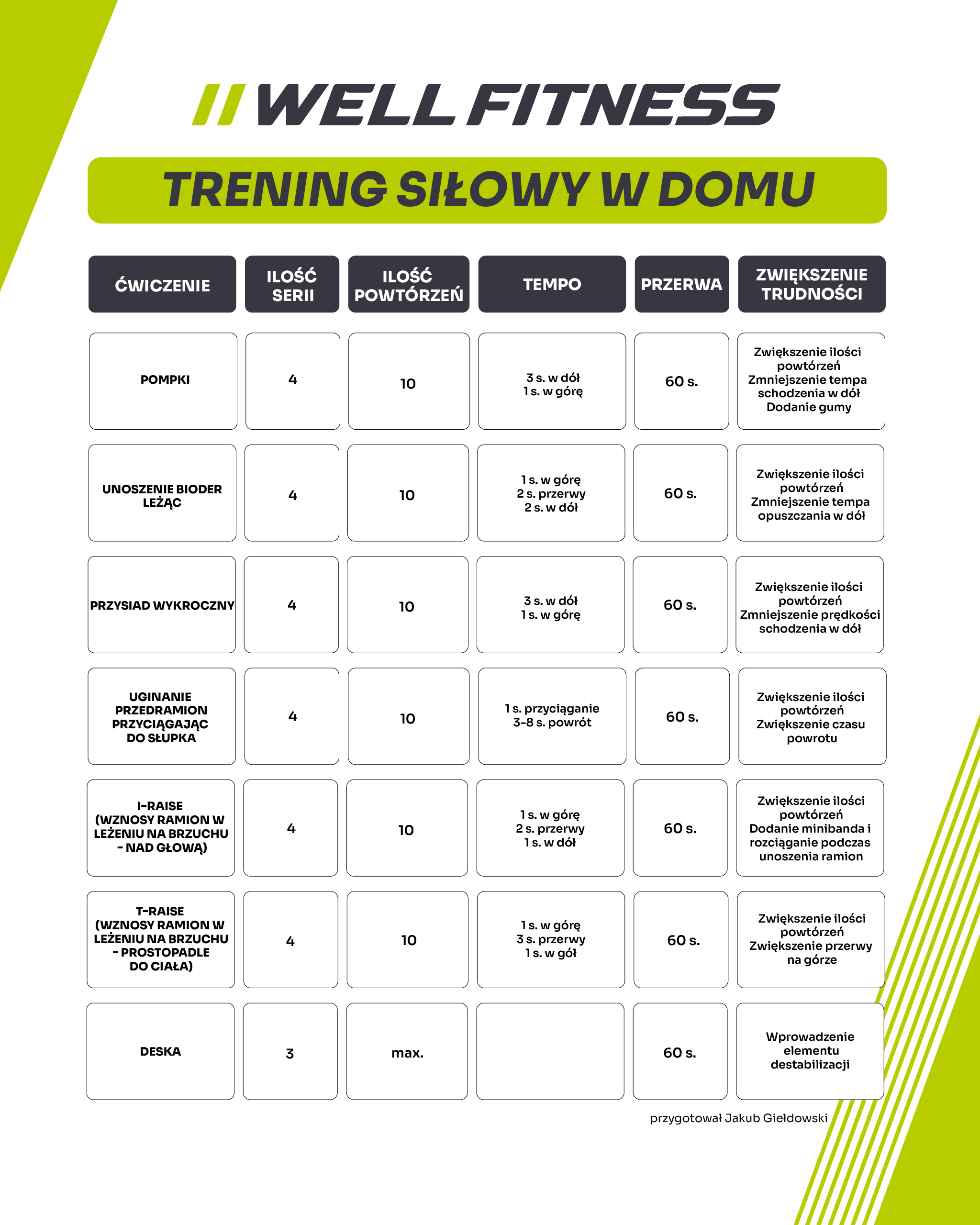 • Progresja: Aby widzieć efekty, musisz stopniowo utrudniać ćwiczenia (tempo, powtórzenia).