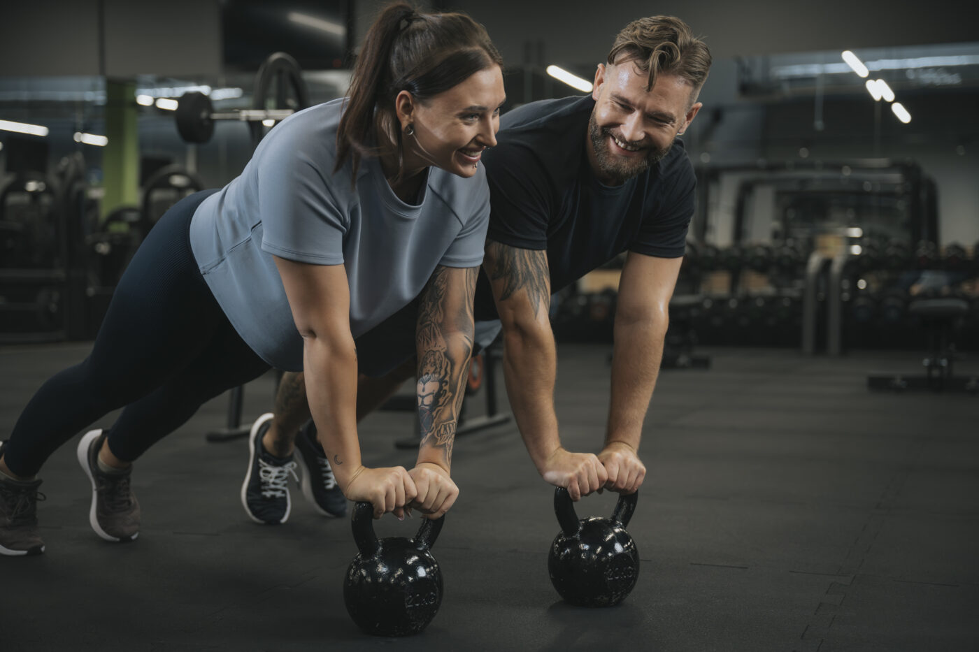 A man and woman train their abdominal muscles in kettlebell support during a fitness club class.